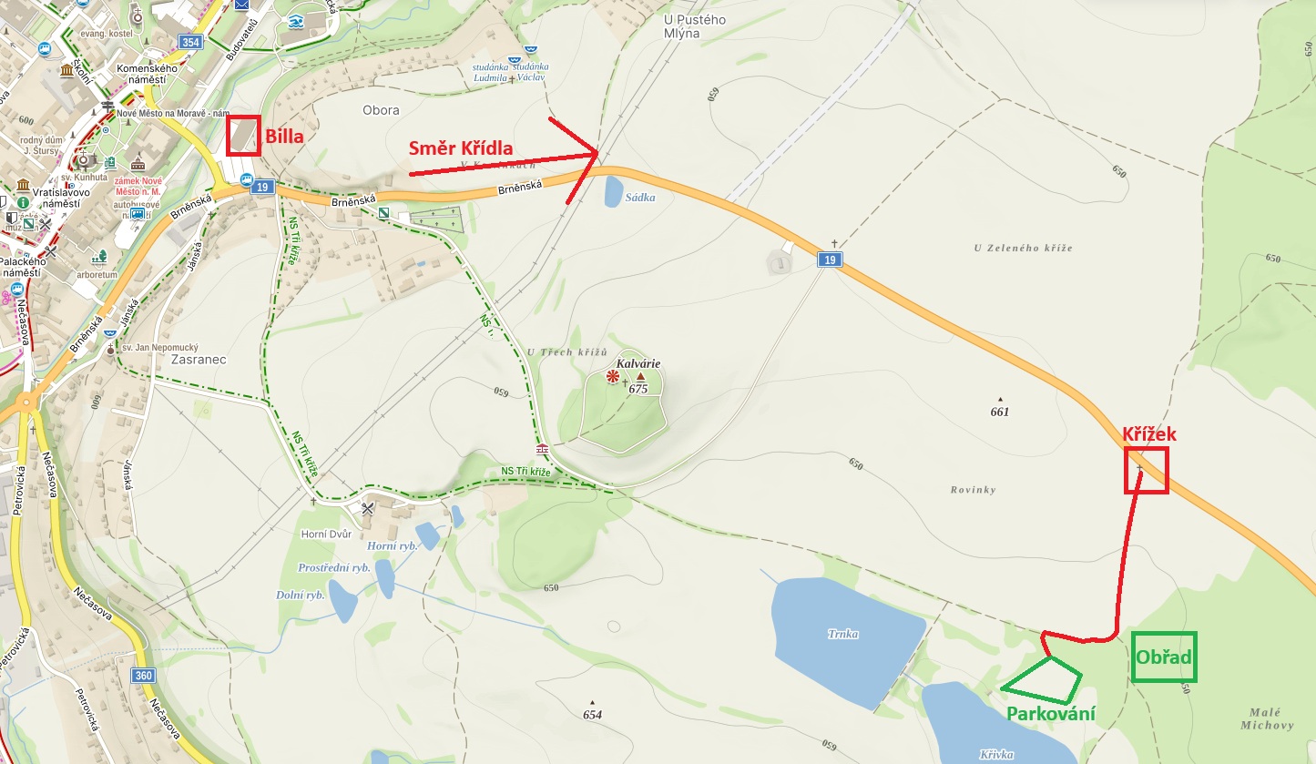 Parkování máme domluvené na louce kousek od lesíka, takže bude možné přijet skoro až na místo 😊. Vydáte se z Nového Města směrem na Křídla. Cca 1,3 km po výjezdu z Města stojí po pravé straně silnice dřevěný kříž (bude označen bílými stuhami). U toho odbočte doprava na polní cestu. Dole na rozcestí už uvidíte někoho, kdo vás donaviguje na louku určenou k parkování.